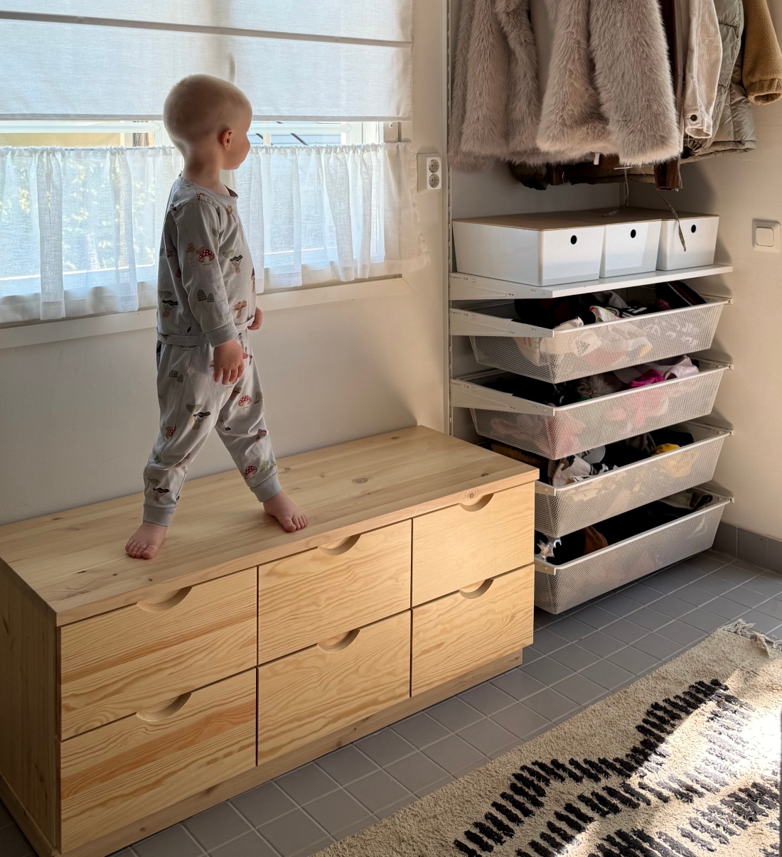 Lapsen itsenäistyessä on mukavaa, jos omat lelut ja tavarat ovat ulottuvilla. Mäntylaatikosto on kaunis lisä lastenhuoneen sisustukseen. Sen laatikoihin sujahtavat kirjat, pelit ja lelut niin, että lapsen on helppo päästä niihin itse käsiksi tarpeen tullen. Selkeä järjestys auttaa myös lasta oppimaan, että jokaiselle tavaralle on oma paikkansa.