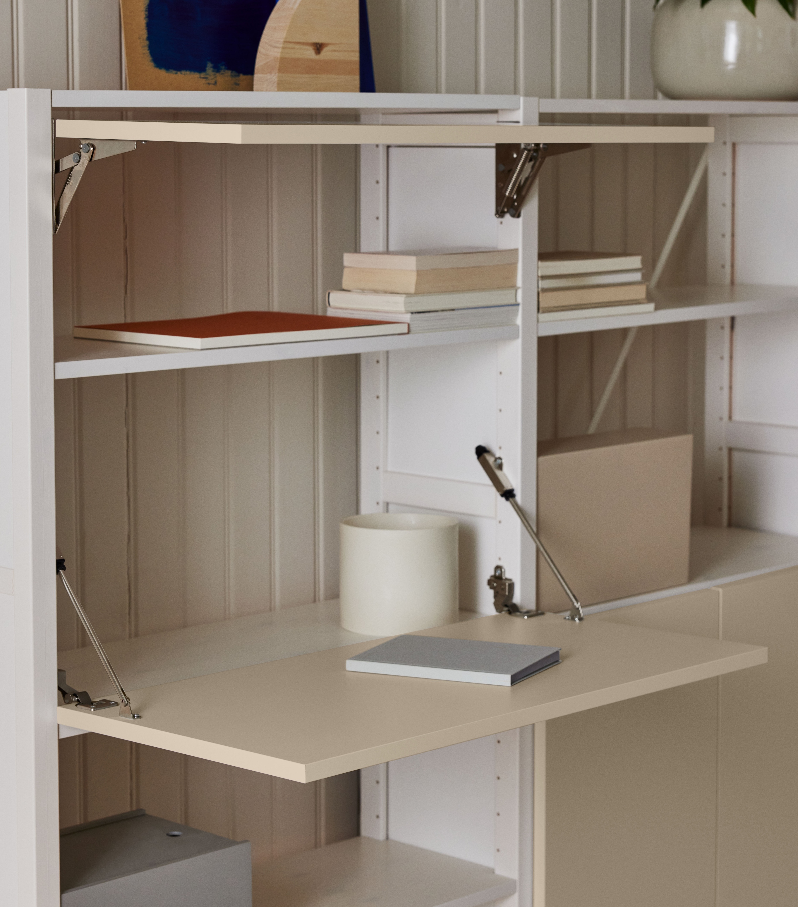 Lundia Classic työpiste sopii erinomaisesti pieneen kotiin, jossa etätyöpiste tai opiskelijan läksynurkka olisi hyvä saada päivän päätteeksi pois silmiltä. Lasku- ja nosto-oven taakse mahtuu erinomaisesti tietokoneen näyttö. Näppäimistön saa nostettu kaapin sisälle päivän päätteeksi, kun työt ovat loppuneet.