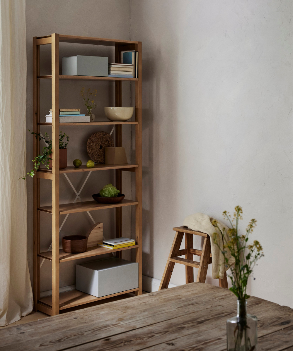 Rytmittämällä hyllyt tismalleen kulloistakin tarvetta vastaavaksi, ne vaikuttavat aina mittatilaustyöltä. Alahyllyt voi mitoittaa vaikkapa säilytyslaatikoiden korkeuden mukaan, keskimmäiset hyllyt sopii säätää suuremmille kirjoille ja ylimmät hyllyt voi tehdä pokkarin mentäviksi. Hylly toimii kätevästi myös tilanjakajana, tarjoten samalla tilaa tavaroiden säilyttämiselle ja kauniille esille panolle.