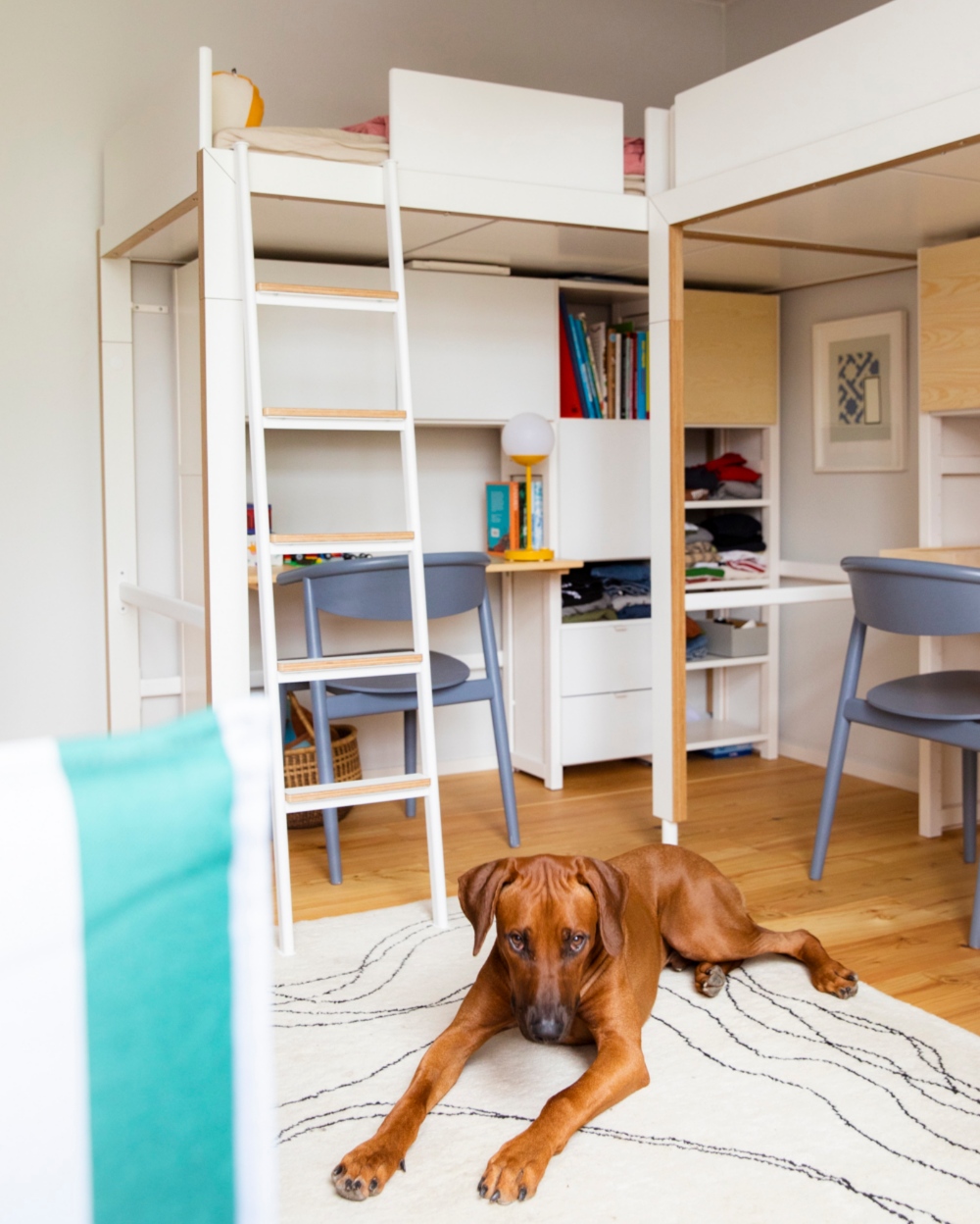 Korkean parvisängyn alle mahtuu sopivasti Lundia Classic kokonaisuus, jonka maksimimitat ovat korkeus 148 cm ja leveys 185 cm. Kuvassa sängyn alla olevassa työpisteessä on 80 cm leveä ja kaksi 50 cm leveää hyllyväliä.