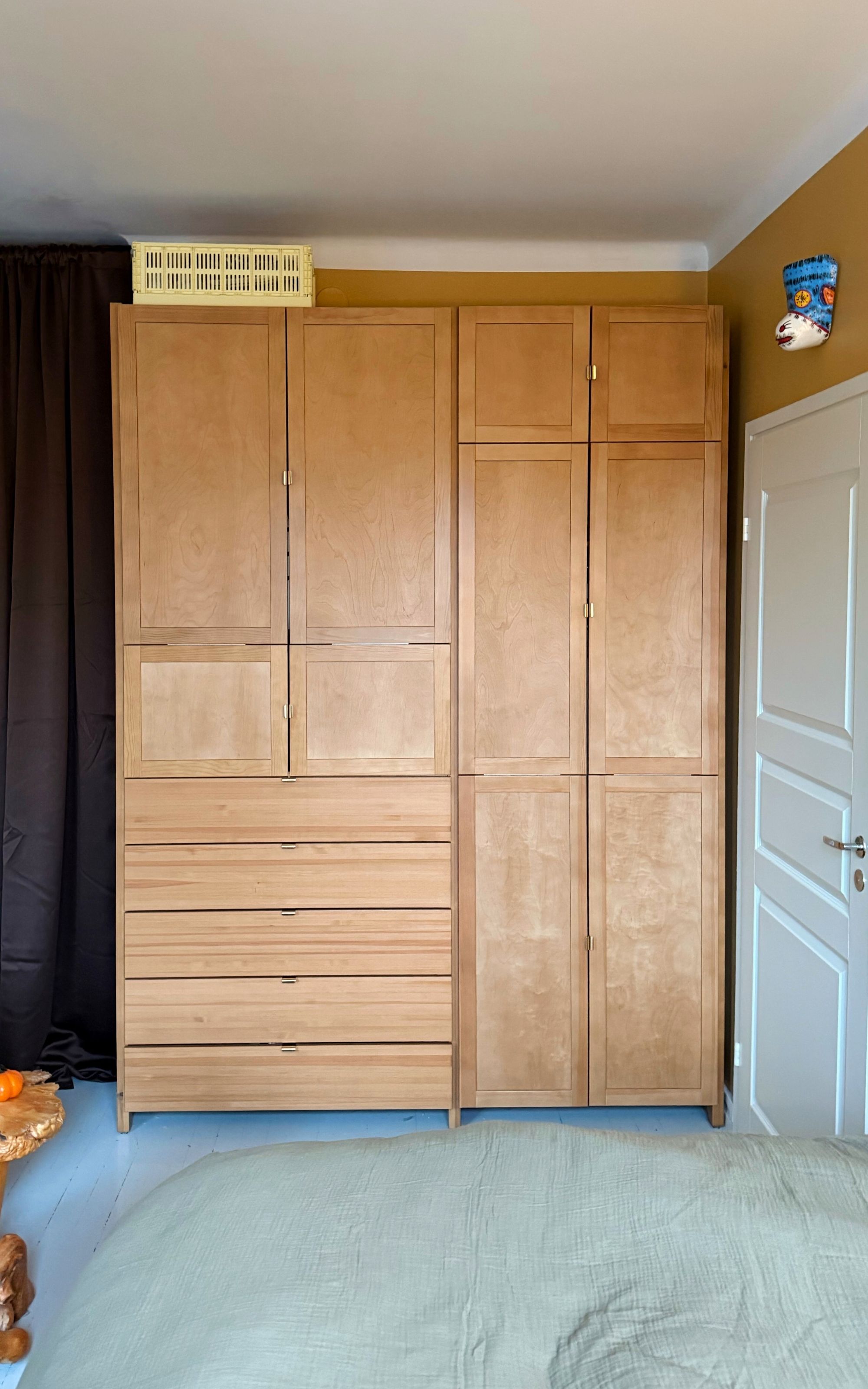 "Meidän pienen kodin säilytystilahaasteita tuli taklaamaan mittatilaus-Lundia! Kaapin paikka oli varsin hankala: kovin syvää kaappia tuohon kohtaan ei mahdu. Pyysin Lundian suunnittelijaa käyttämään koko tilan hyödyksi ja antamaan mulle paljon tankoja ja vetolaatikoita. Ja hei kuinka kaunis tää materiaali on! Kaappi on siis ruskealakattua mäntyä ja ovet ruskealakatut vaneritäyteovet. Tää sävy ja kullanväriset vetimet sopii ihan täydellisesti mun kodin sävyihin ja myös 1920-luvun talon arvokkuuteen."